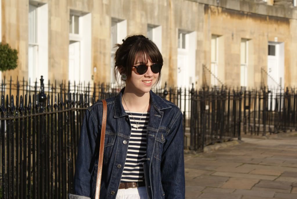 Hello guys - apologies for another similar outfit post today! And also for a fairly boring outfit. I'm in a bit of a wardrobe rut at the moment. The last few mornings I've looked at my closet and just stood there thinking 1) I have nothing to wear, or 2) I really don't feel like wearing anything at all. So, when in doubt I tend to grab the classic pieces I own; like my Breton tee and denim jacket. You can't really go wrong because they are timeless. My big plastic flower earrings are old ones of my Nan's from the 60s, how cool are they? And when I'm working I just throw my hair into a bun, so sorry to look a bit dull!