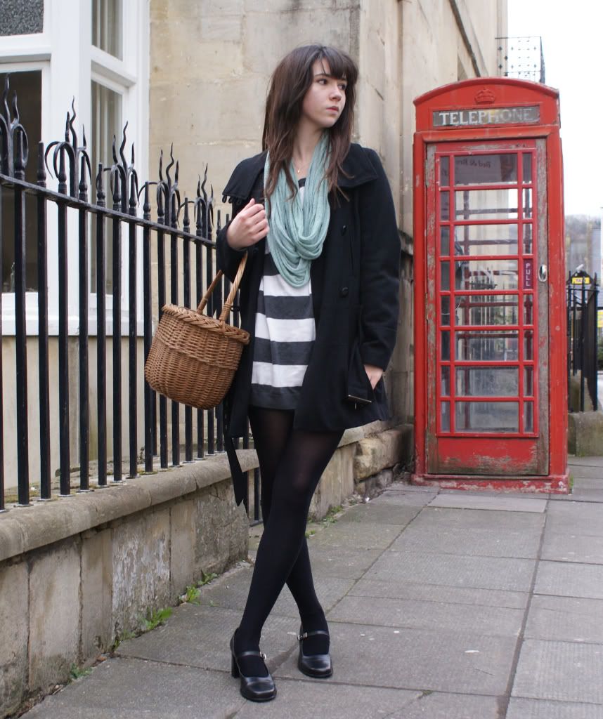 Took some snaps in the wind today in front of a lovely phone box before heading off to get a Mint Frappe form Nero's. Why did we get rid of all the cool old English stuff like the red London buses and phone boothes like these? They were so iconic and lovely and perfectly British. It's sad to see them rusting away in forgotten corners. Anyway, I threw on an old stripey jumper and tights today for fear of being splattered by paint in the shop! I know I tend to wear longer skirts and dresses but sometimes it's nice for a change to wear something shorter. I've had this black pea-coat for years now, like these shoes, it goes with anything. I'm wearing my Urban Revisions snood again, I love the colour and it's already shredded so if it snags in my basket it doesn't matter. I bought some amazing jeans today, they're so 70s - flared at the bottom and that gorgeous deep-blue denim. They are now my one and only pair of jeans. I have so many nice tops and don't always want to wear skirts with them, so these are perfect!